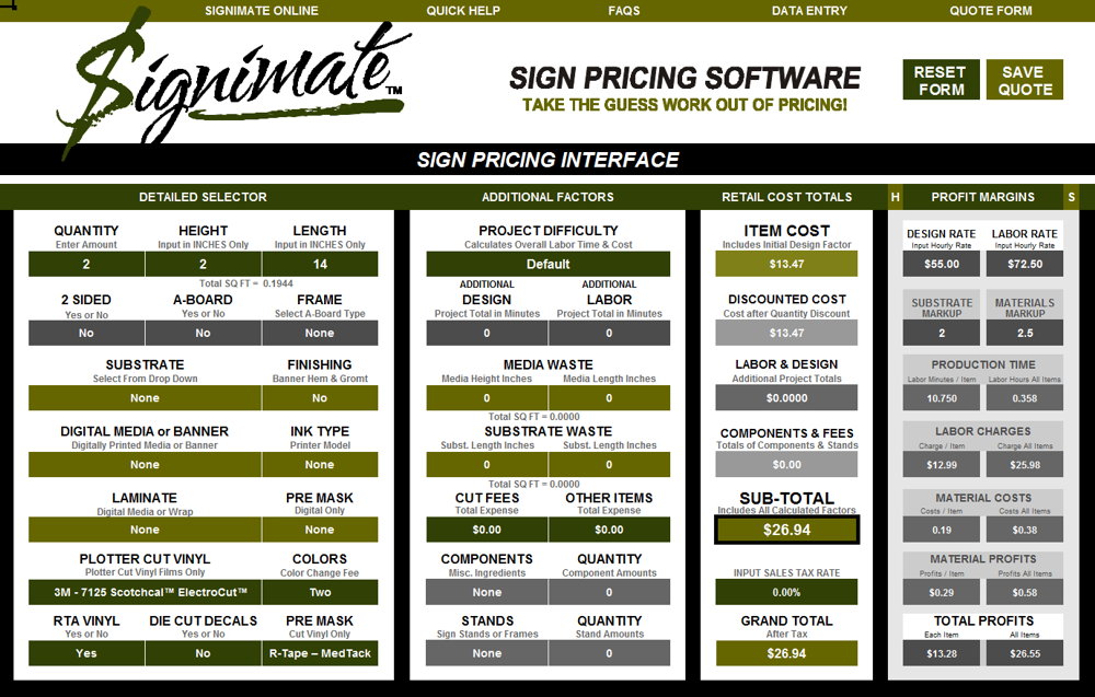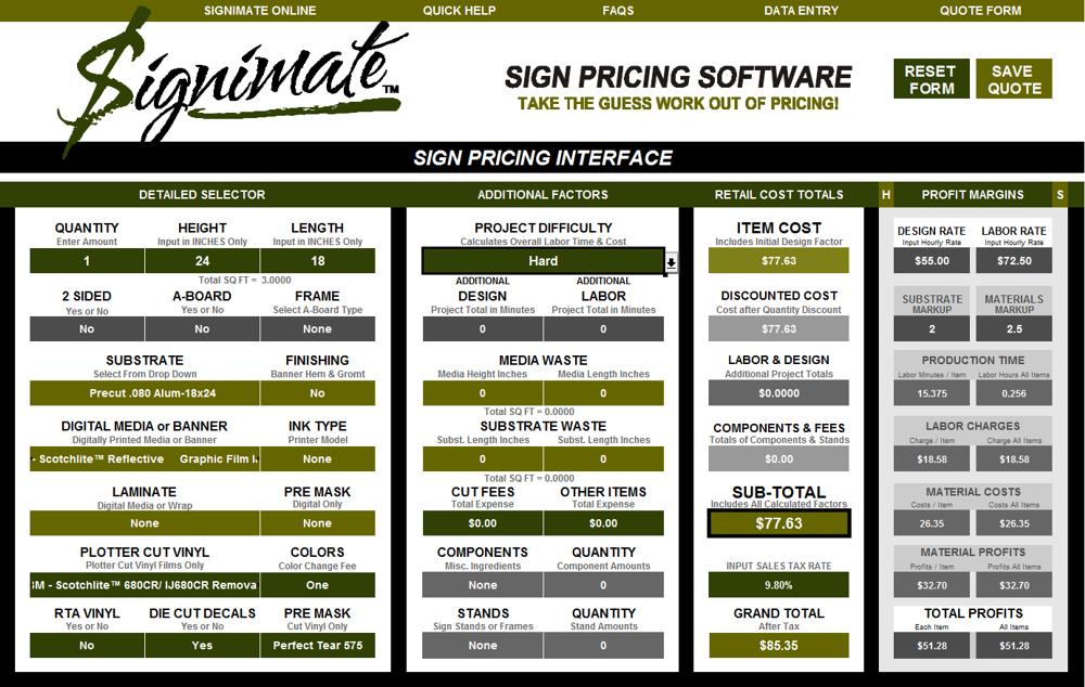 Step one:  With SigniMate™ sign pricing software program open, Press the Reset Form Button, then enter the following:  quantity one, input height, input length, one sided, choose 10 MM Corex, choose digital media, choose ink type, you can choose laminate if desired, pre-mask would be set to none, plotter cut vinyl would be set to none, colors would be set to one, or rta vinyl would be set to no, die cut details would be set to no, pre-mask would be set to none, project difficulty would typically be set to default, additional design in additional labor is to your choosing.